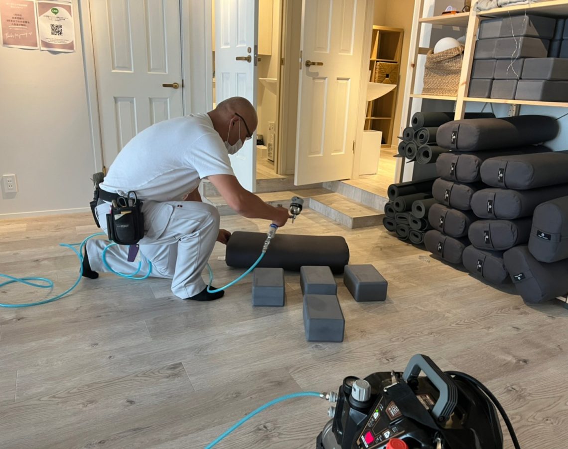 スタジオ内全体を対象とし、また、ヨガマット、ブロック等のプロップス類全てにわたり施工いたしました。