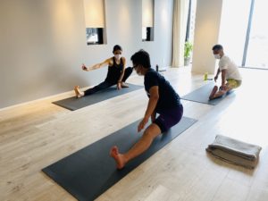 レッスン前後には生徒さんの体調を一人一人確認していきます。体と心の状態は 人それぞれ、日々違います。レッスンではその人の今の 体調に合ったポーズを選んでいます。「Aさんはここに手をついて 、Bさんは床までついてみましょう。」など、 グループレッスンなのにまるでマンツーマンのパーソナルレッスンであるかのような密度でした!